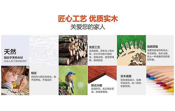 “实木系列产品注重品质、追求完美、崇尚自然、关注健康,为此精选全球优等树种原材直接加工,零化学添加、产品零辐射、甲醛无测出;它具有木材自然生长的纹理、是热的不良导体、能起到冬暖夏凉的作用、符合孕妇、婴儿、老人等对环境家居高要求的环境下使用。”